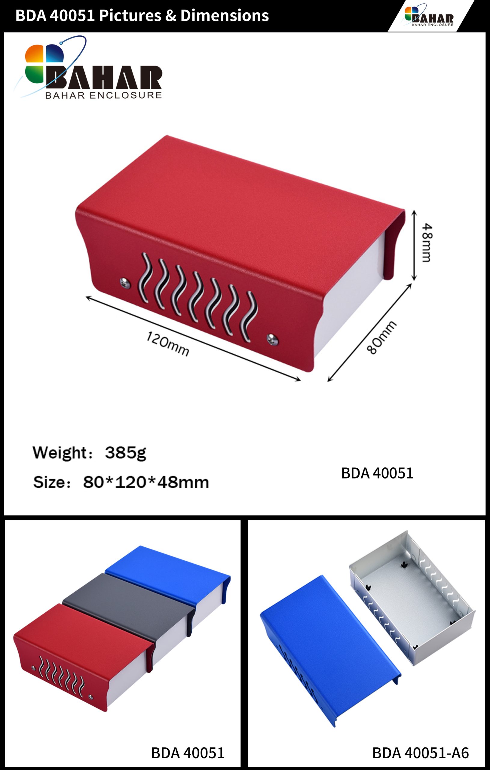 The Bahar BDA series includes aluminum and iron metal casing boxes that are durable and versatile for electronics projects. They come in various sizes and colors, suitable for different applications.