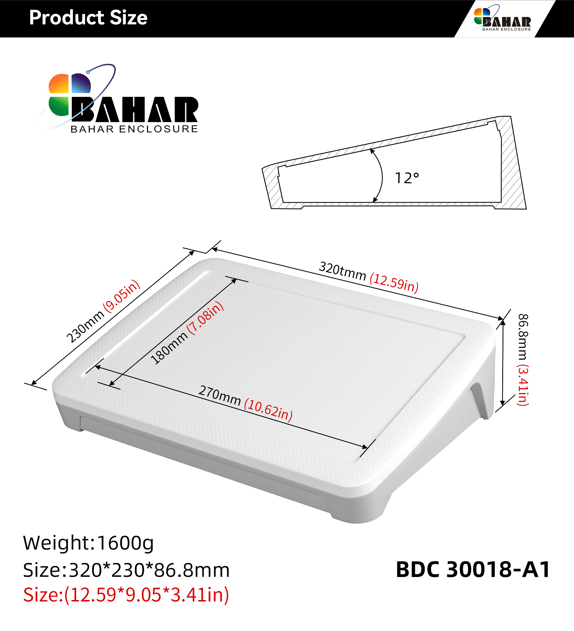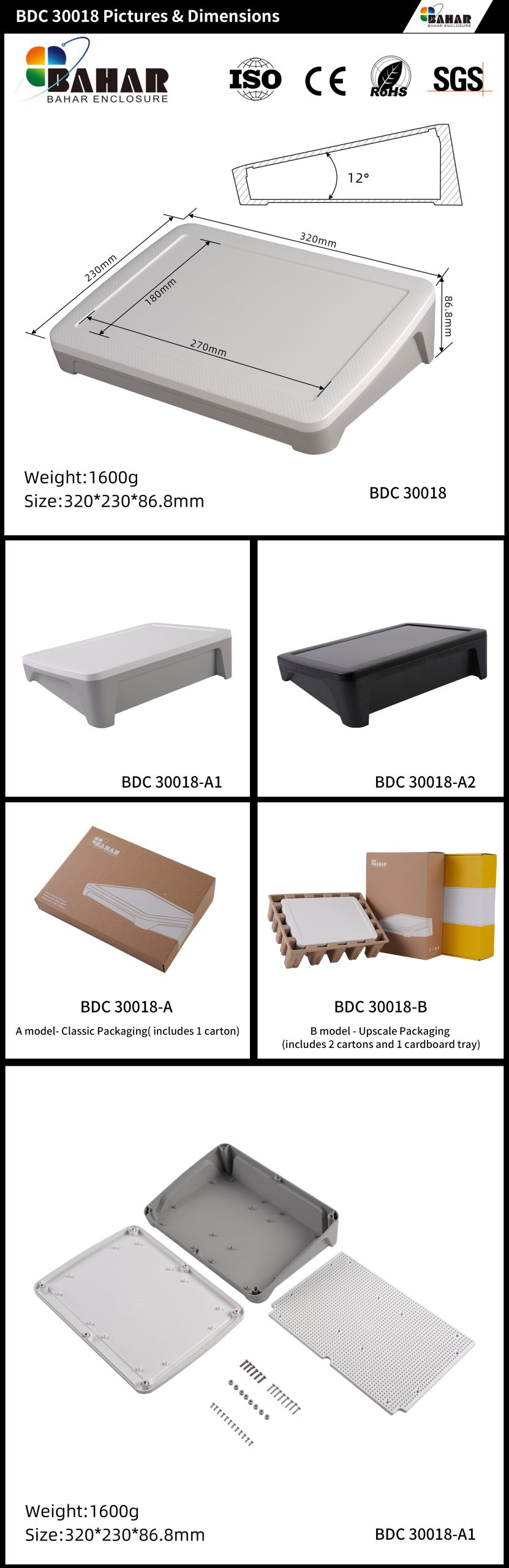 The Bahar BDC series offers fully plastic casing boxes with a unique angle design for easy electronic device use. It provides ample space for modules, keys and displays, available in different sizes and colors.