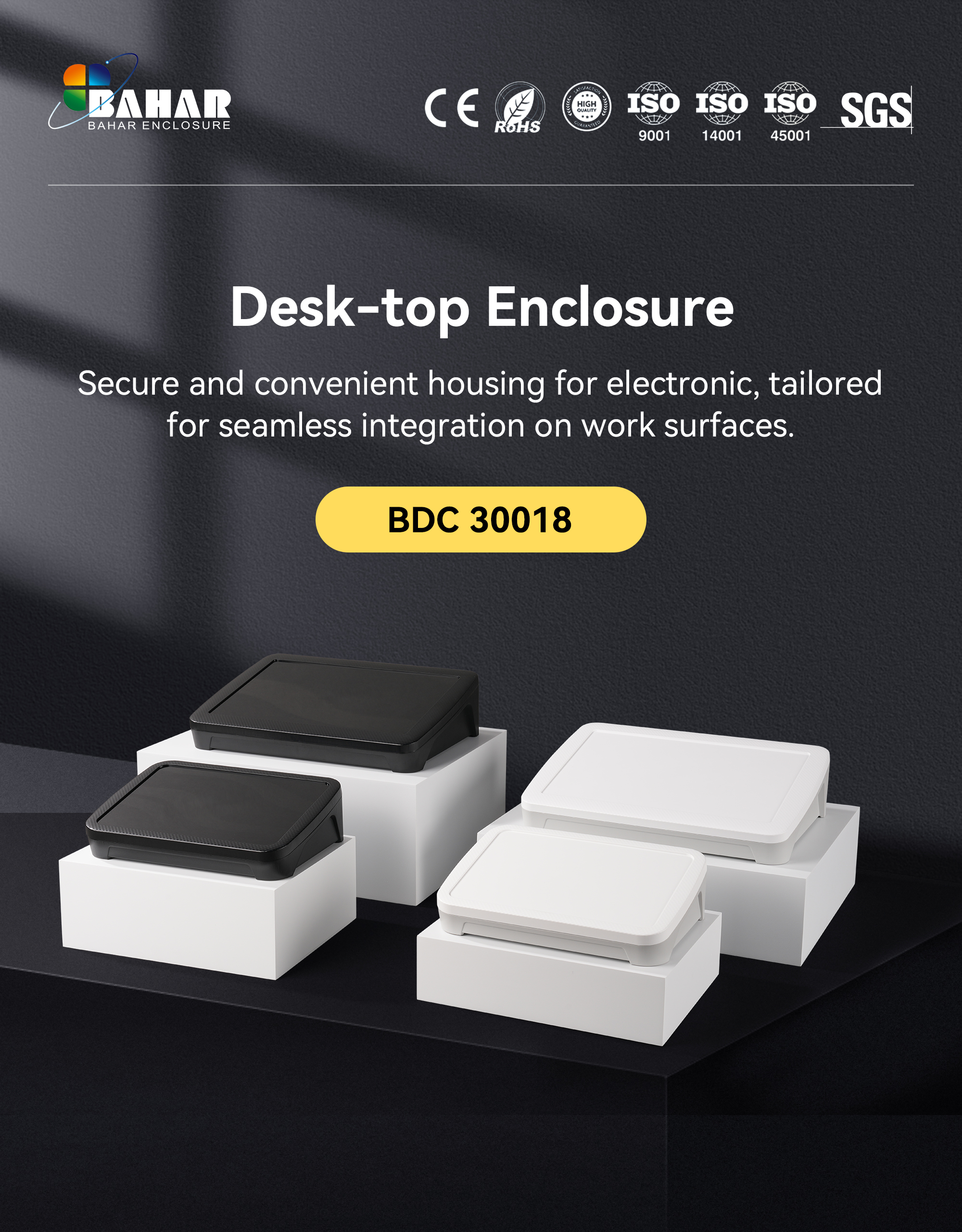The Bahar BDC series offers fully plastic casing boxes with a unique angle design for easy electronic device use. It provides ample space for modules, keys and displays, available in different sizes and colors.